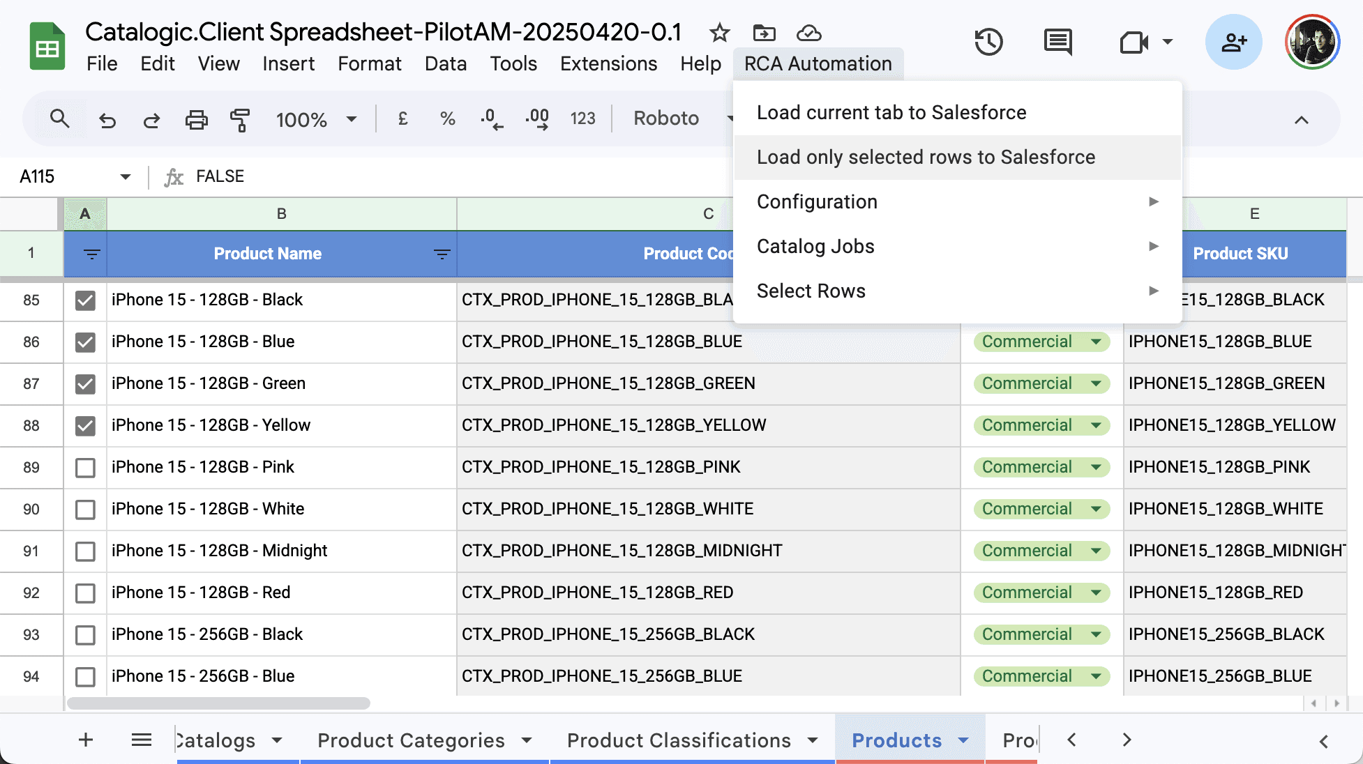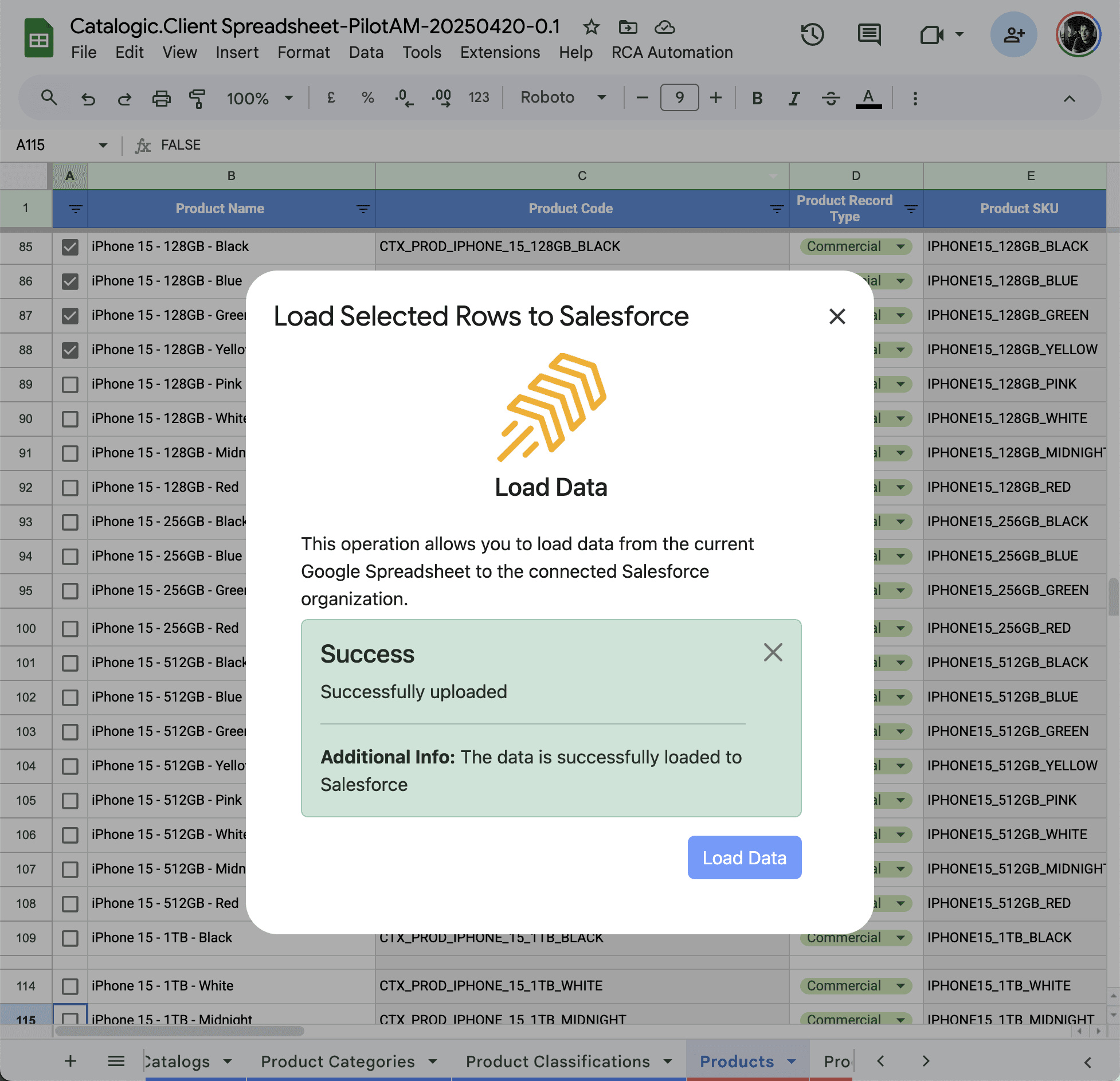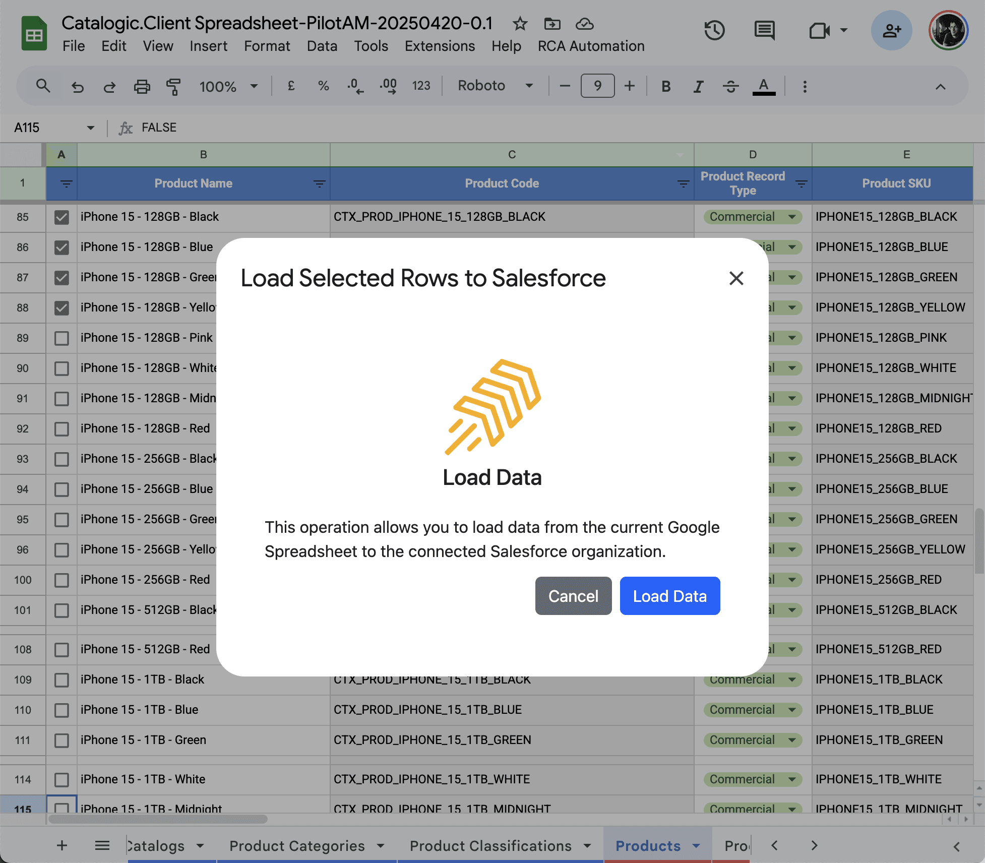 From the menu bar, choose: Catalog Automation > Load only selected rows to Salesforce