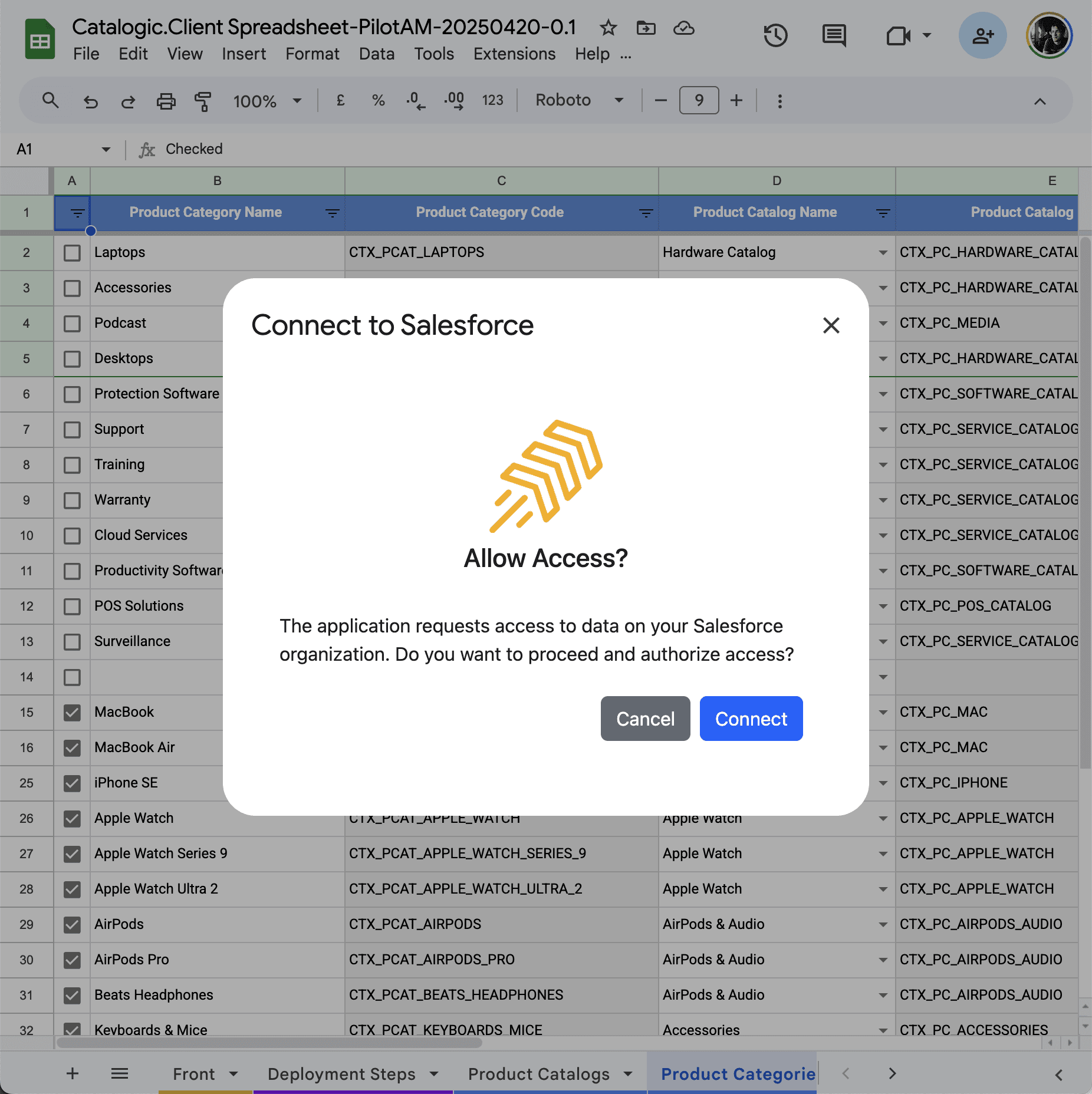 This will redirect you to a Salesforce authorization page where you’ll be prompted to allow access from the Catalogic spreadsheet application.