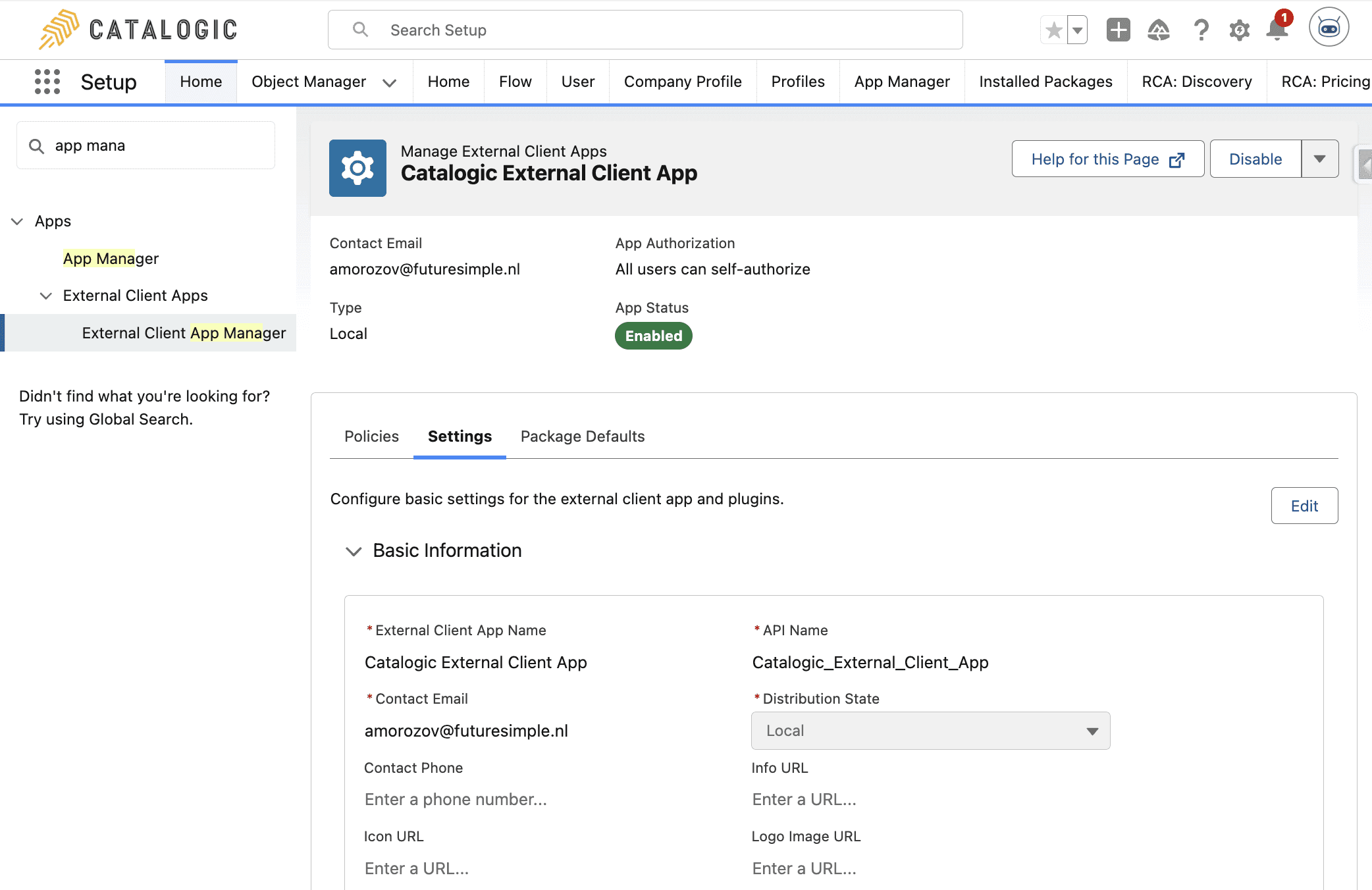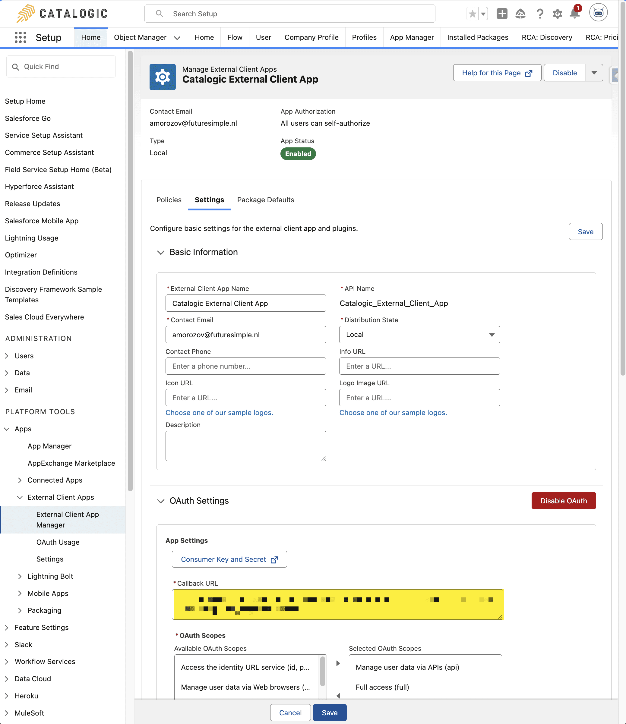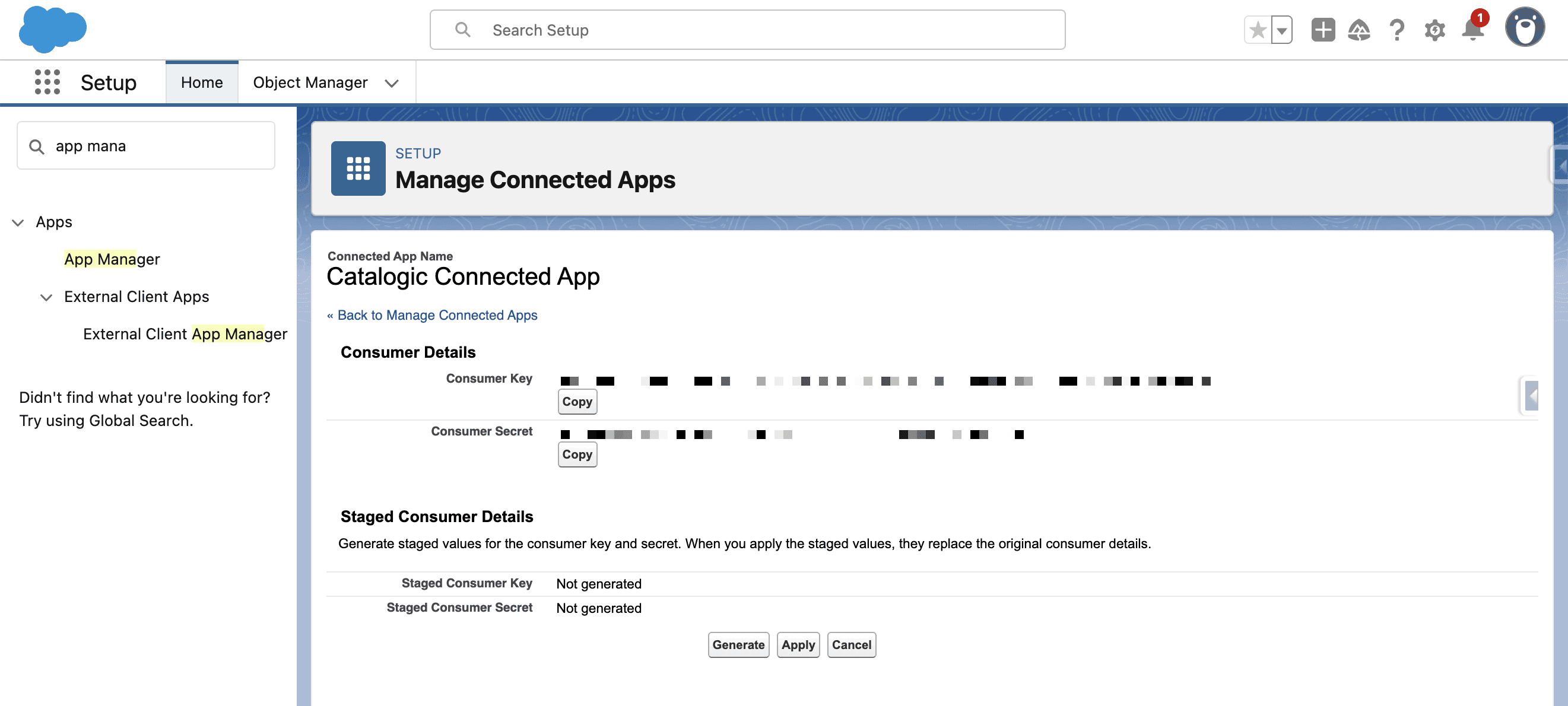 To enable secure communication between the Catalogic spreadsheet (powered by Google Apps Script) and your Salesforce organization, a Connected App is required. This app handles OAuth 2.0 authorization for pushing and pulling data between the systems. We will use the app you created earlier in the process.