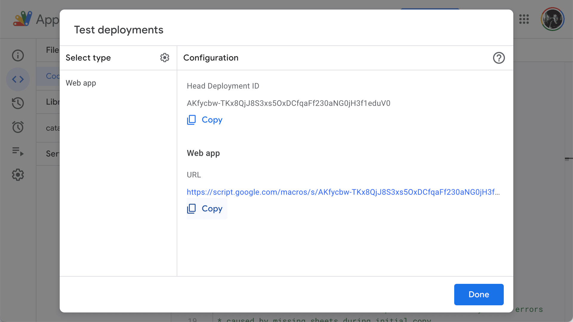 URL of the test deployment (copied earlier from the script editor)