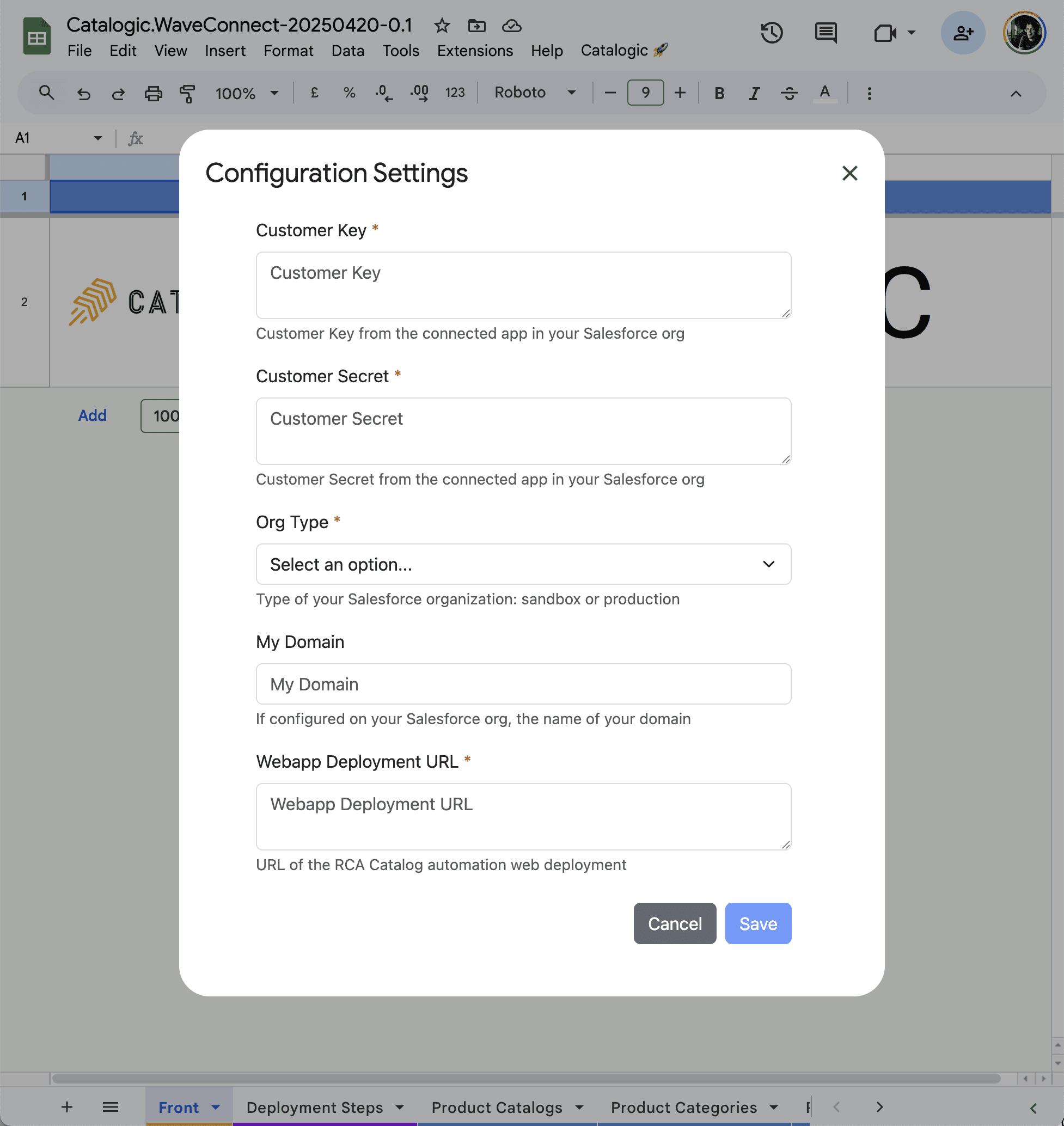 Welcome to the Catalogic Installation Guide. This document provides step-by-step instructions for installing and configuring Catalogic, a tool that allows you to define and manage product catalog configurations using a Google Spreadsheet — and then publish those configurations directly into your connected Salesforce org.