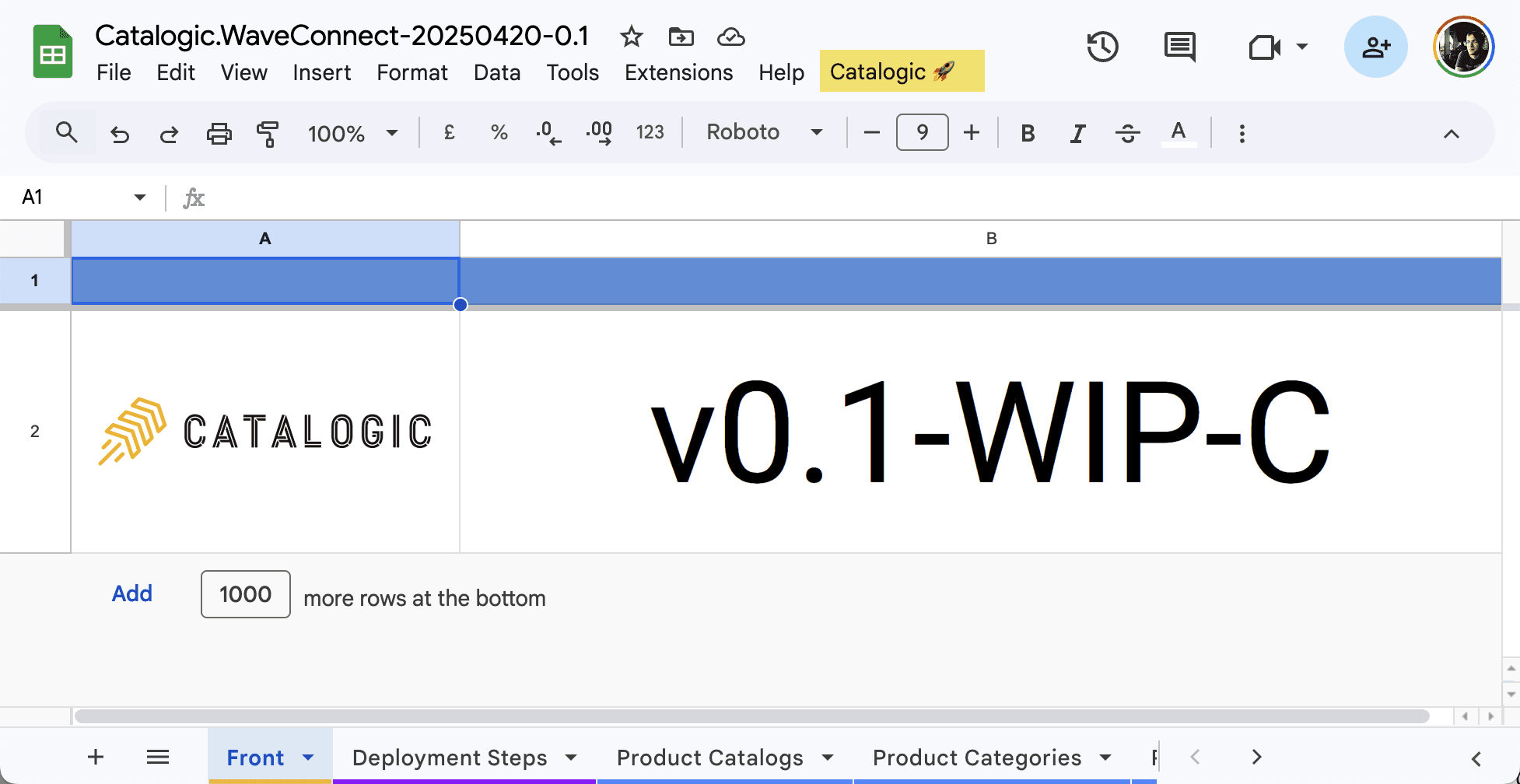 Once copied, your spreadsheet will include the linked Apps Script project needed to run Catalogic. If everything works as expected, you will see the Catalogic 🚀 menu item. You will apply a small configuration change to the script later in the installation process.