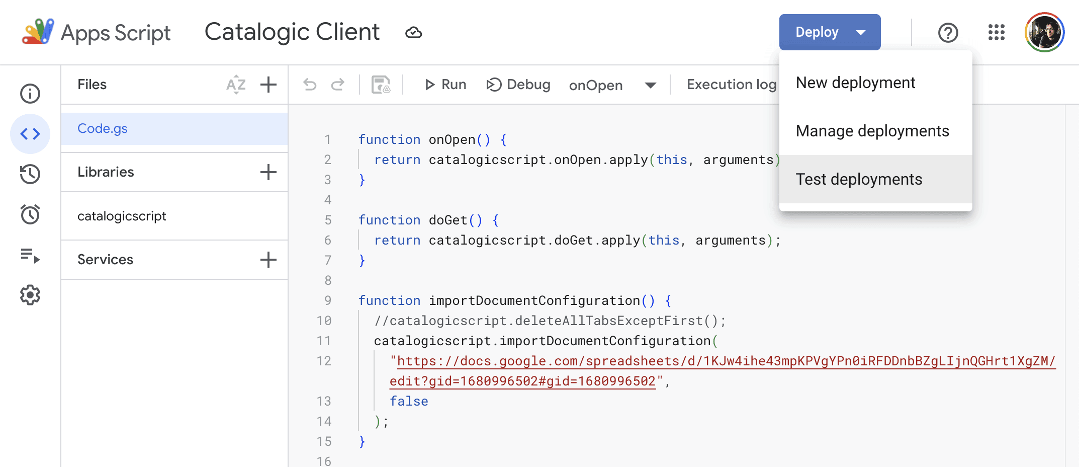 In the menu bar of your Catalogic spreadsheet, select: Extensions > Apps Script